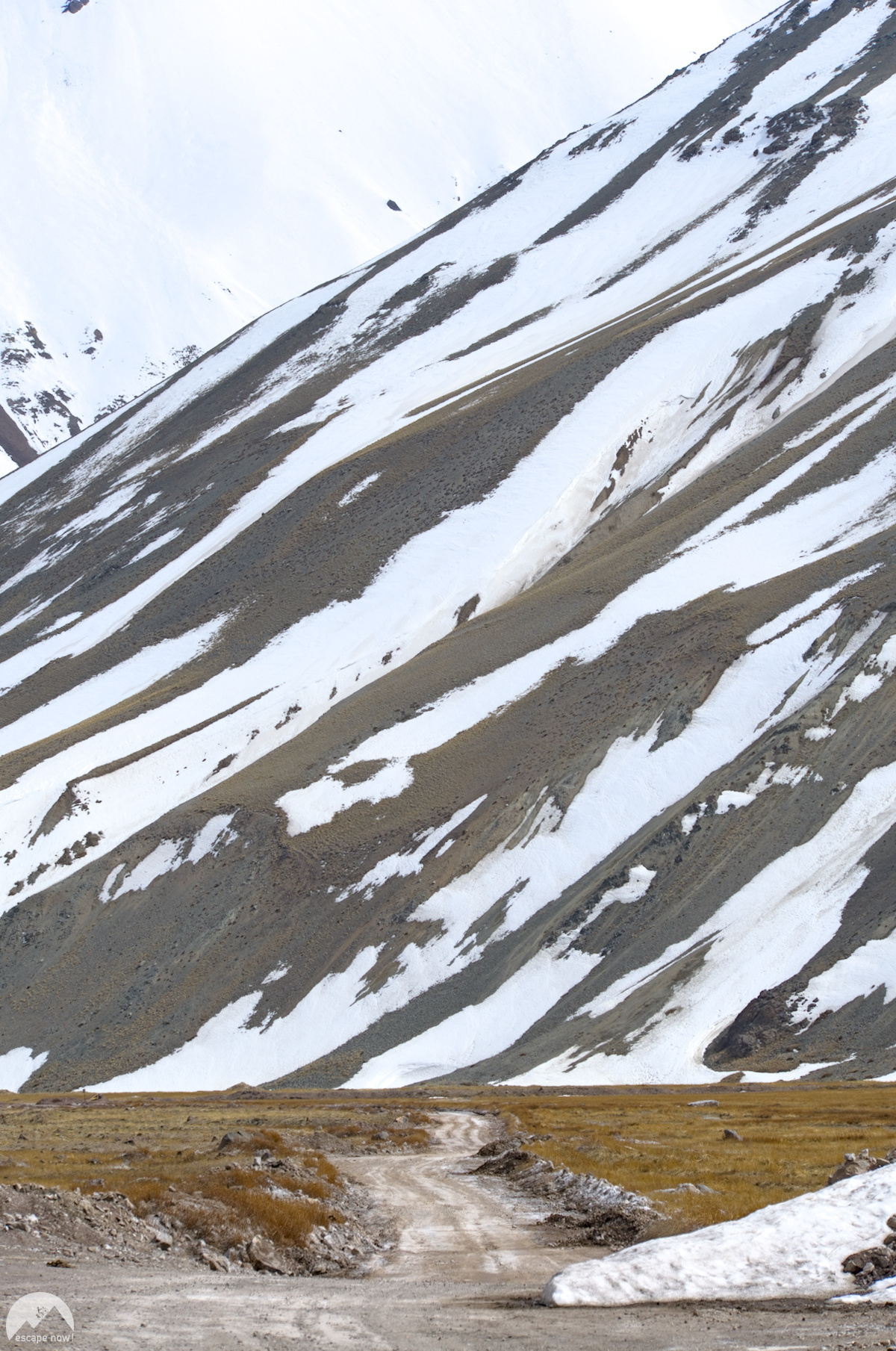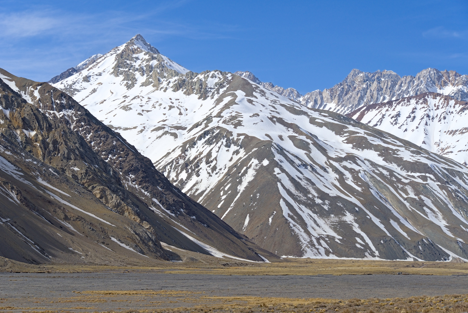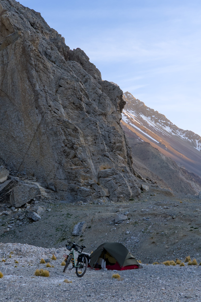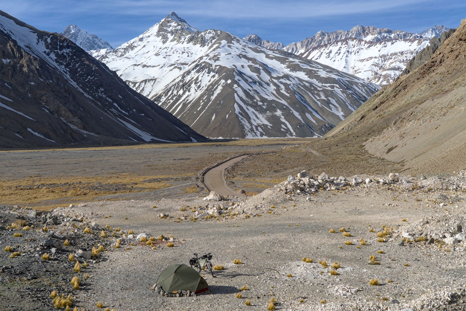 Und genau das ist mein kleines Reich. Diese magischen Berge strahlen eine unglaubliche Faszination und Ruhe auf mich aus und lassen mich breit grinsend zur absoluten Entspannung kommen. Auch wenn es viel Schweiß und Kraft kostet, dann noch ein Stückchen höher hinauszuradeln; entgegenkommende Fahrzeuge immer wieder gefühlt einen ganzen Wüstensturm an Staub in mein Gesicht treiben – das Ergebnis ist für mich die beste Entspannung. Am Ende des Tages das Zelt an einem Bergbach oder in der weiten Ebene eines hohen Tals mit schneebedeckten Riesen jenseits der 4000er als Kulisse aufzustellen, wo dann noch das cremige Licht der Abendsonne hinein strahlt – das ist absoluter Genuss.